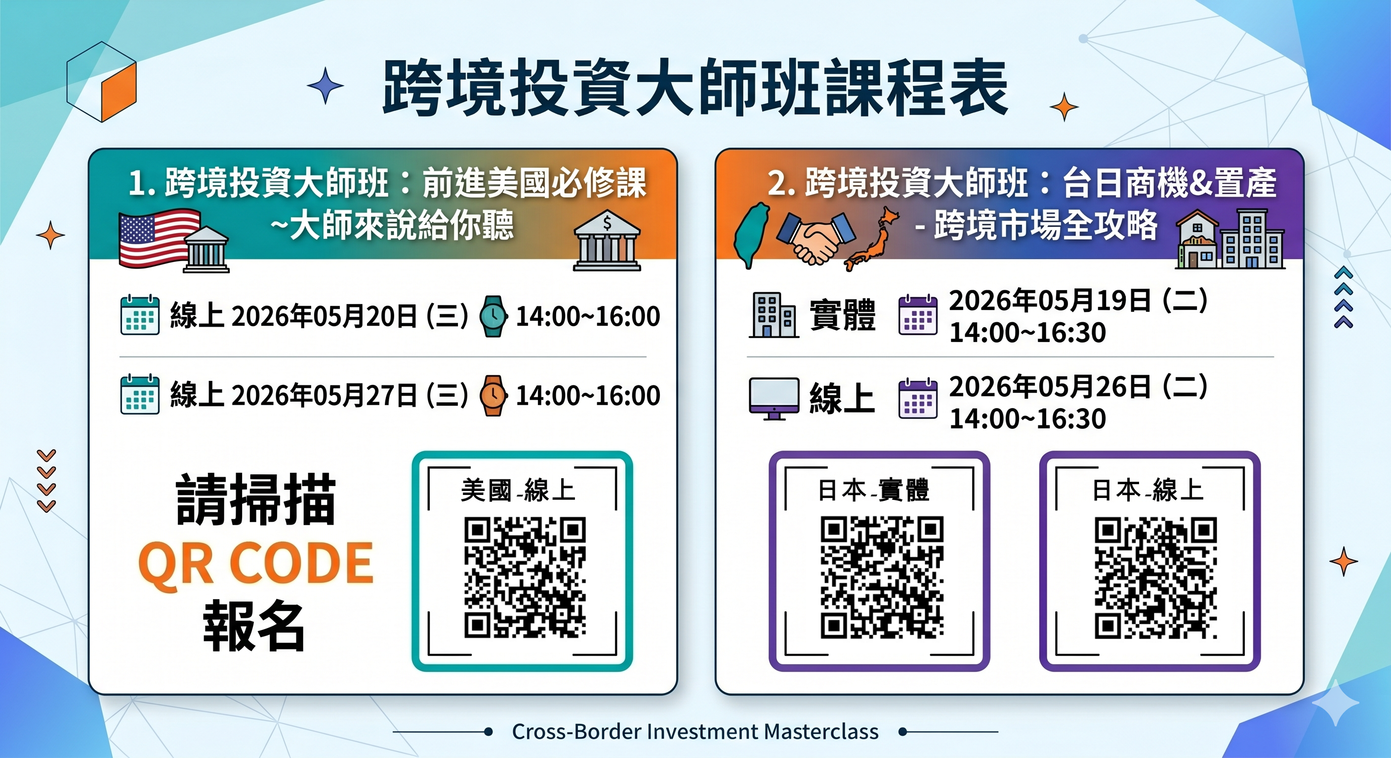 A. 跨境投資大師班 : 台日商機&置產 - 跨境市場全攻略 ( 詳細課程資訊請到課程頁面 https://reurl.cc/mpyyQ9)